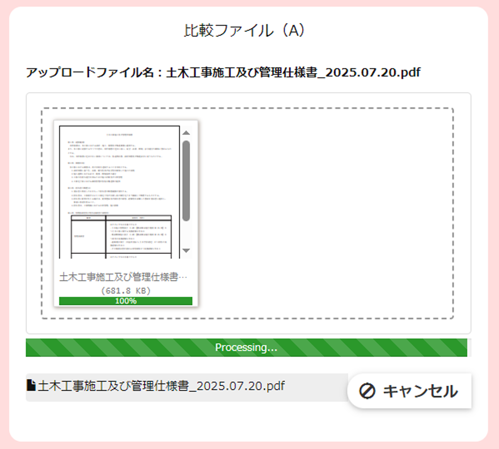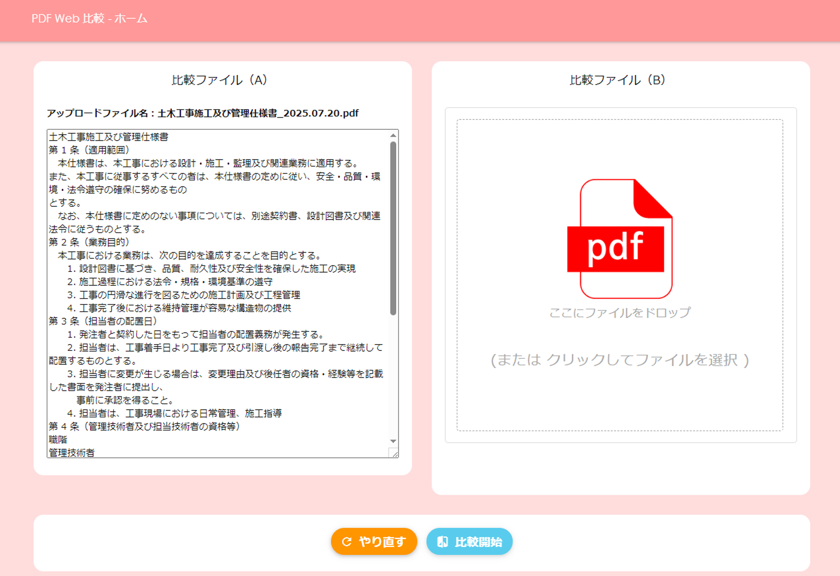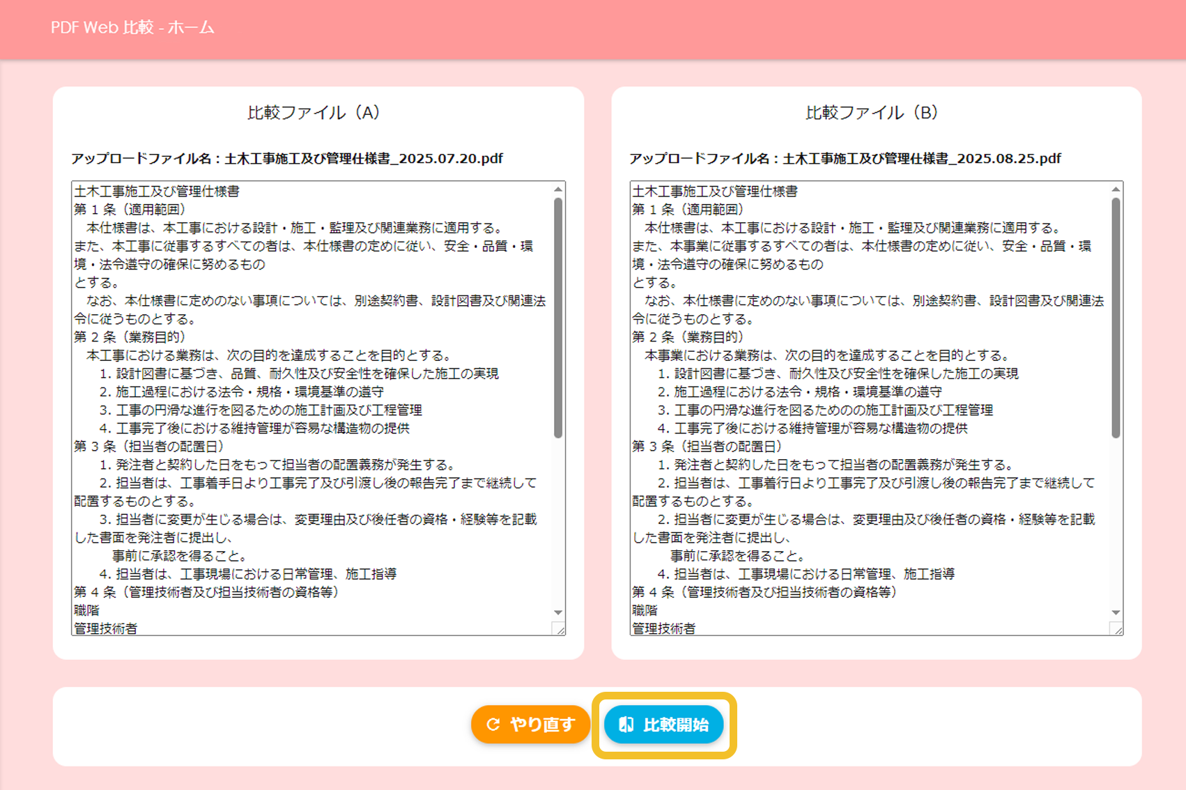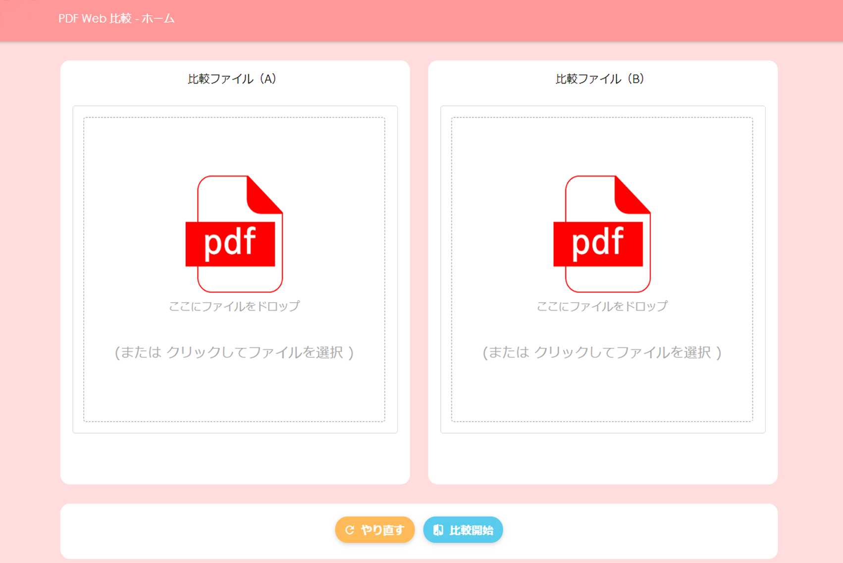 2つのPDFのアップロードが完了したら、「比較する」をクリックします。(別のPDFを比較したい場合は、隣の「リセットする」をクリックしてください)